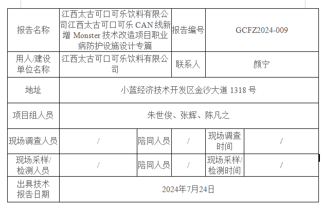 上一篇:江西太古可口可樂飲料有限公司江西太古可口可樂CAN線新增Monster技術(shù)改造項目職業(yè)病危害預(yù)評價報告書GCYP2024-030
