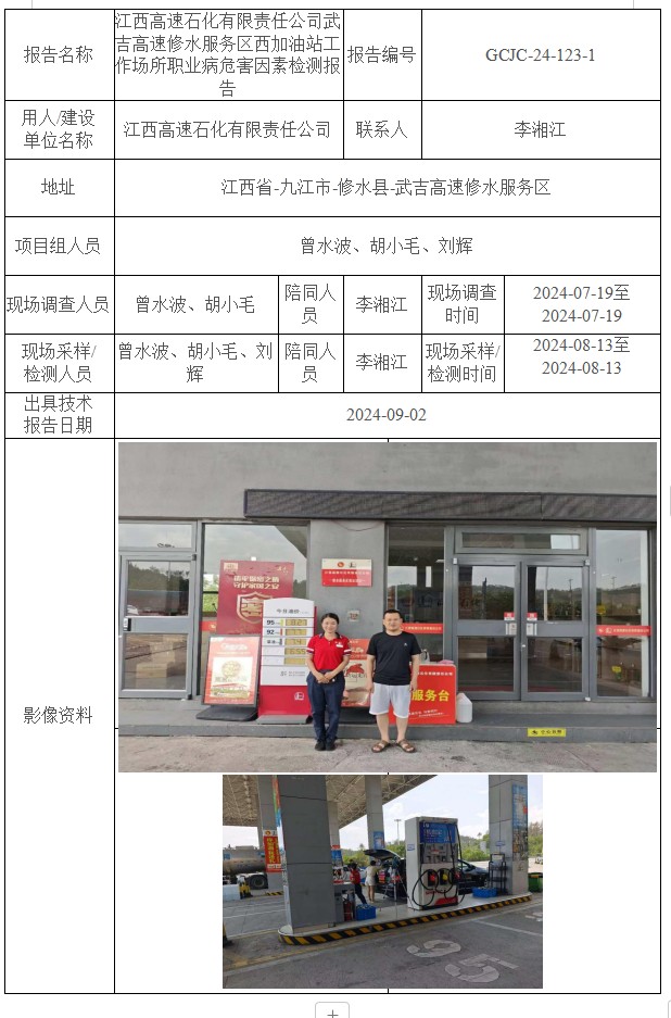 江西高速石化有限責任公司武吉高速修水服務(wù)區(qū)西加油站工作場所職業(yè)病危害因素檢測報告