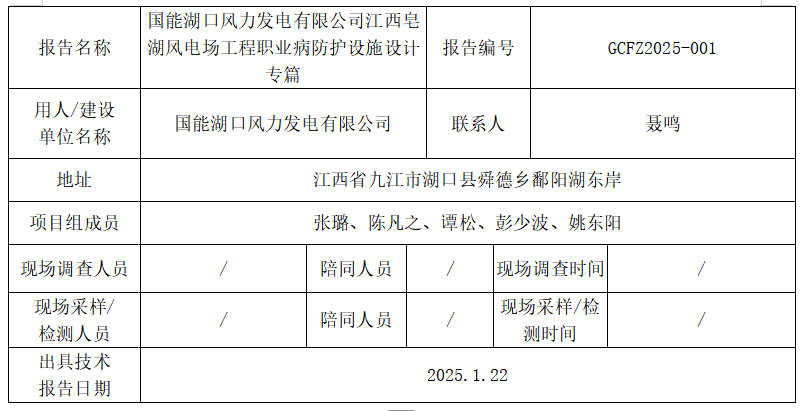 國能湖口風力發(fā)電有限公司江西皂湖風電場工程職業(yè)病危害預評價報告書