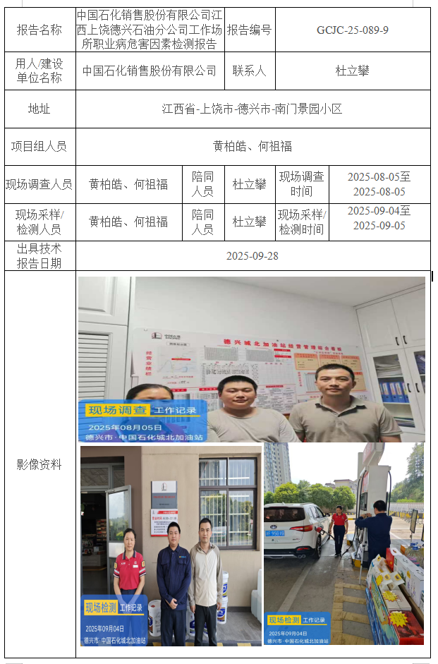 中國石化銷售股份有限公司江西上饒德興石油分公司工作場所職業(yè)病危害因素檢測報告