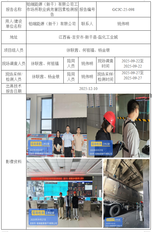 鉑瑞能源(新干)有限公司工作場(chǎng)所職業(yè)病危害因素檢測(cè)報(bào)告
