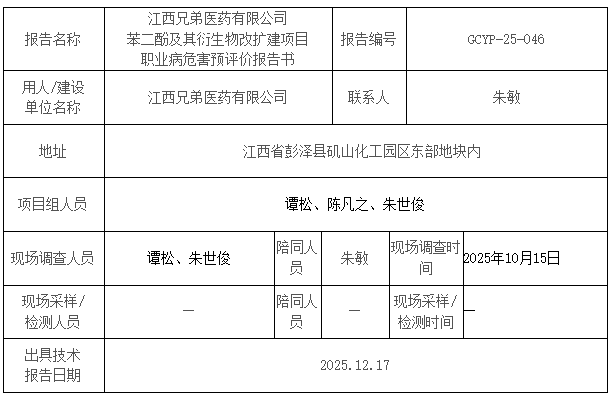 江西兄弟醫(yī)藥有限公司 苯二酚及其衍生物改擴(kuò)建項(xiàng)目 職業(yè)病危害預(yù)評價(jià)報(bào)告書