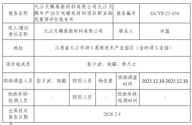 九江天賜高新材料有限公司九江天賜年產(chǎn)20萬(wàn)噸鋰電材料項(xiàng)目職業(yè)病危害預(yù)評(píng)價(jià)報(bào)告書(shū)