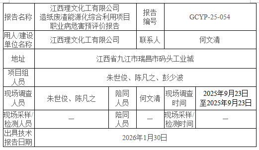 江西理文化工有限公司造紙廢渣能源化綜合利用項目職業(yè)病危害預評價報告